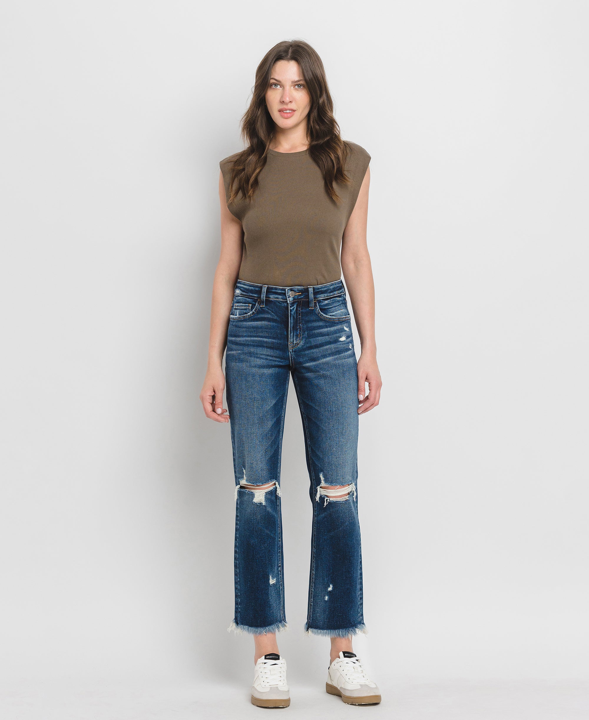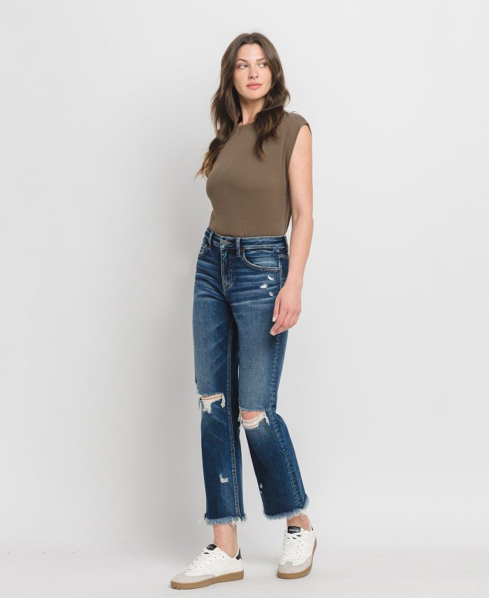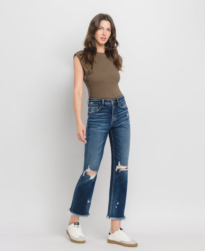 Our Integrated High Rise Ankle Straight Jeans are crafted with comfort stretch denim, these jeans feature a flattering high rise waist and distressed detailing for a touch of edge. The raw hem and ankle length add a relaxed and effortless vibe to these straight jeans. Elevate your denim game with these premium jeans.